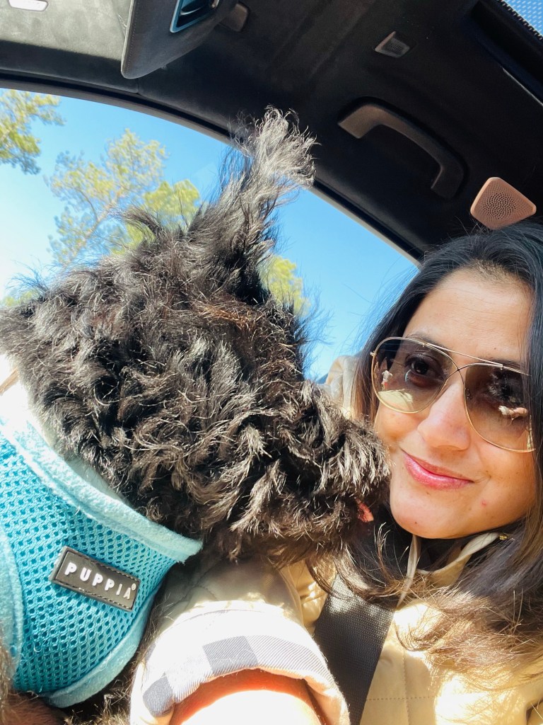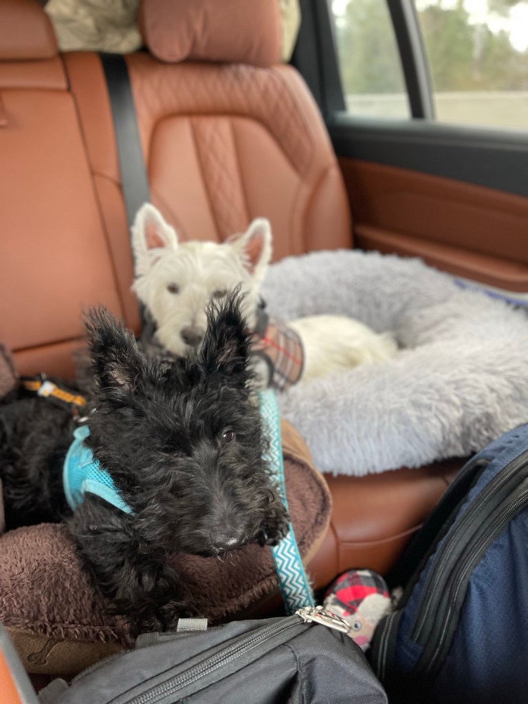 I sleep pretty fitfully throughout the night. Anxiety?!?! The sound of the heat turning off every now and then doesn’t help either. It’s amazing how different sounds can mess with your sleep (let’s not even get into how uncomfortable mattresses and pillows in hotels can be). Thus, the day begins early. Very early…like at 5 am. The dogs need to go. Bagheera has figured the pee pads and goes (phew!!). Fitch needs to be taken out. Eleven floors down, in the dark, at 5 am. And soon, we are packed, and ready to leave. The journey towards our final destination begins.