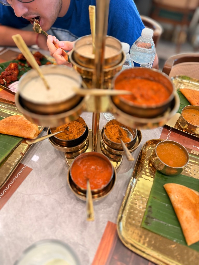 The dosa course followed, and this was where things got truly exciting. We were served a plain dosa, benne dosa, and idli. The benne dosa was the star of the evening — soft, rich, and soaked in ghee, it had that melt-in-your-mouth quality that made it unforgettable. If we come back (and we probably will), this is what we’ll be ordering again.